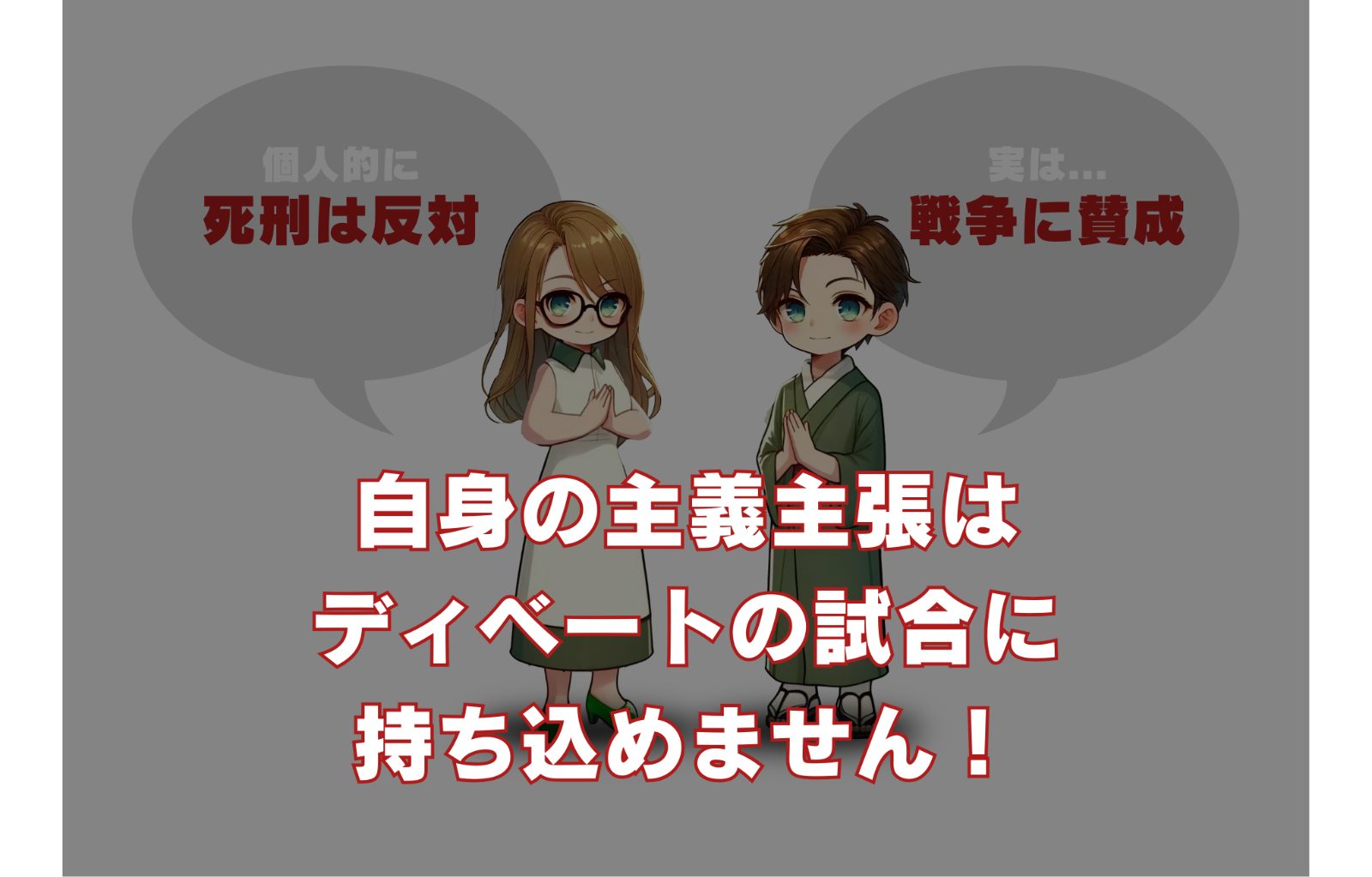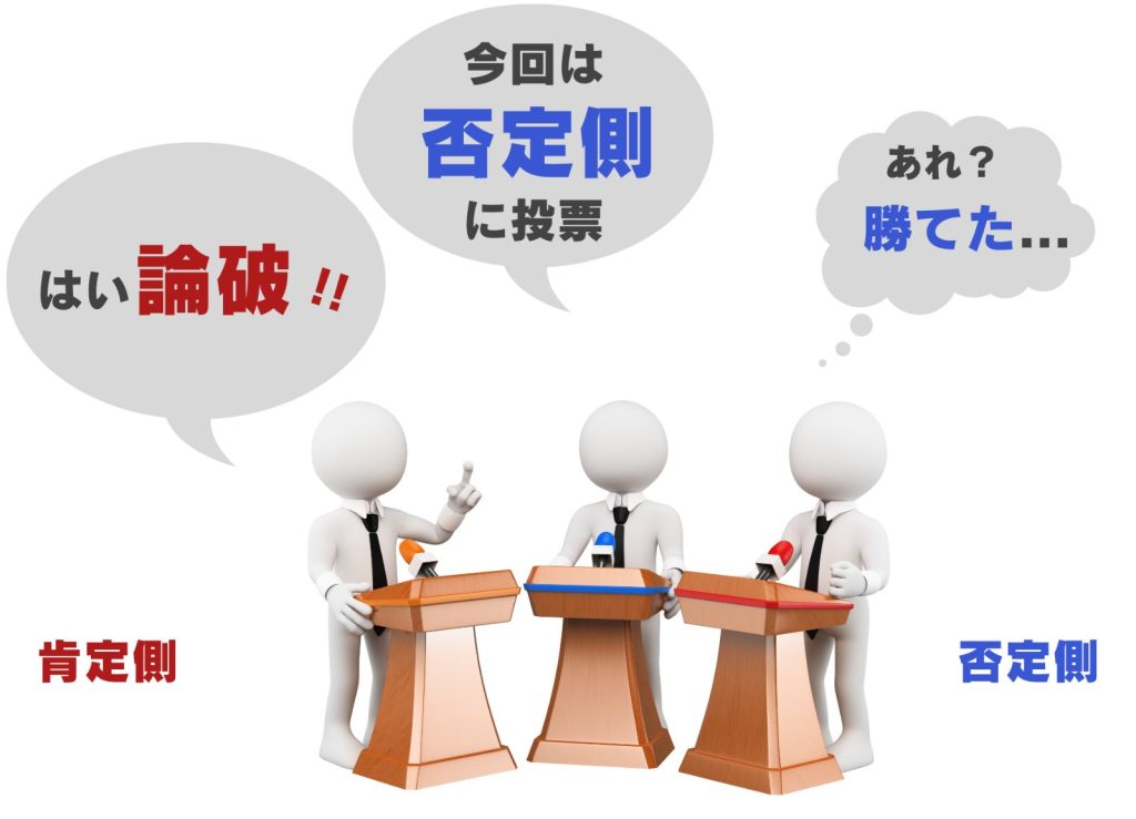 例えば、あなたが死刑反対であっても、賛成側になれば死刑賛成の議論を作り、最後まで賛成派として試合に臨むことになります。