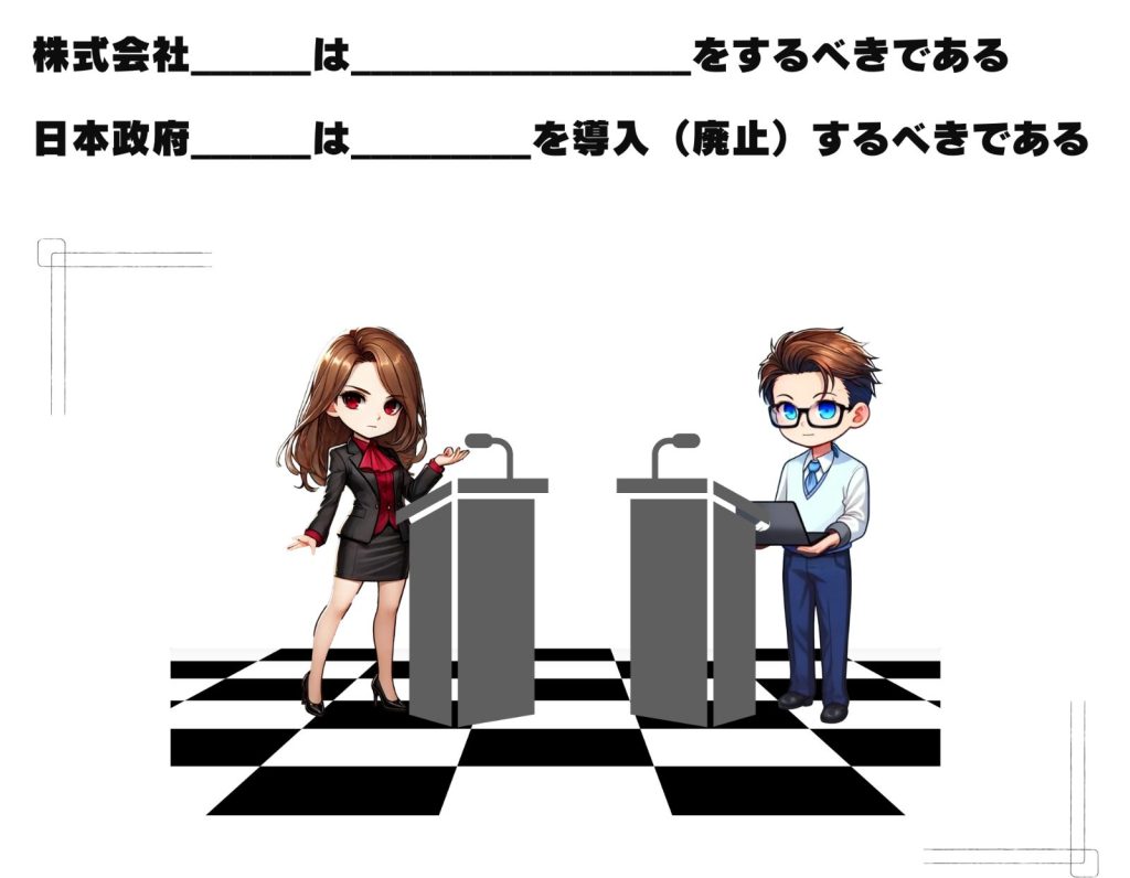 ディベートとは、特定のテーマについて異なる立場に分かれて議論を戦わせる、討論をゲーム化したものです。