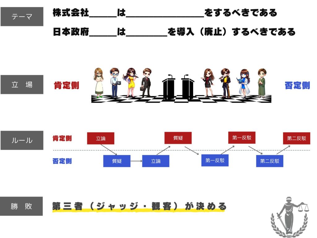 事前にテーマが与えられ、自分の意見にかかわらず、肯定側と否定側に分かれ、相手やジャッジと呼ばれる第三者を説得するために理論的な議論を展開します。
